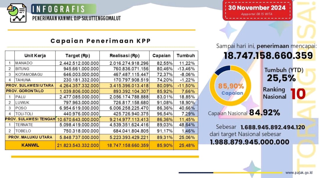 Hingga 30 November 2024, Kanwil DJP Suluttenggomalut mencatat realisasi penerimaan pajak sebesar Rp18,747 triliun, atau setara 85,90% dari target Rp21,8 triliun. Dibandingkan periode yang sama tahun lalu, capaian ini menunjukkan pertumbuhan signifikan sebesar 25,48%.