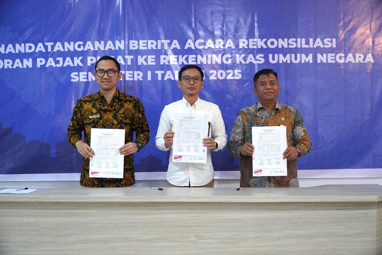 penandatanganan Berita Acara (BA) Rekonsiliasi atas Penyetoran Pajak Pusat Periode Semester I Tahun 2025 bertempat di Aula KPPN Kotamobagu (Kamis, 31/7).