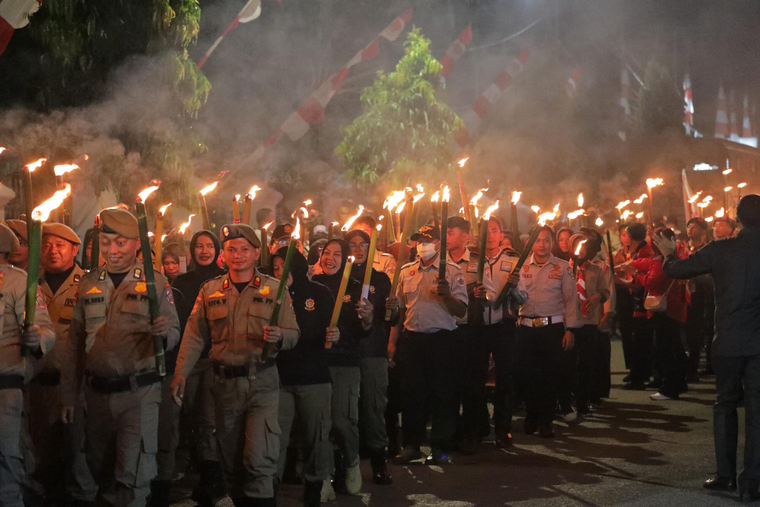 Usai dilepas Wali Kota, peserta pawai berjalan sambil membawa obor menyusuri sejumlah jalan utama di Kota Kotamobagu. Suasana semakin semarak dengan lantunan lagu-lagu nasional yang dinyanyikan penuh semangat oleh para peserta.