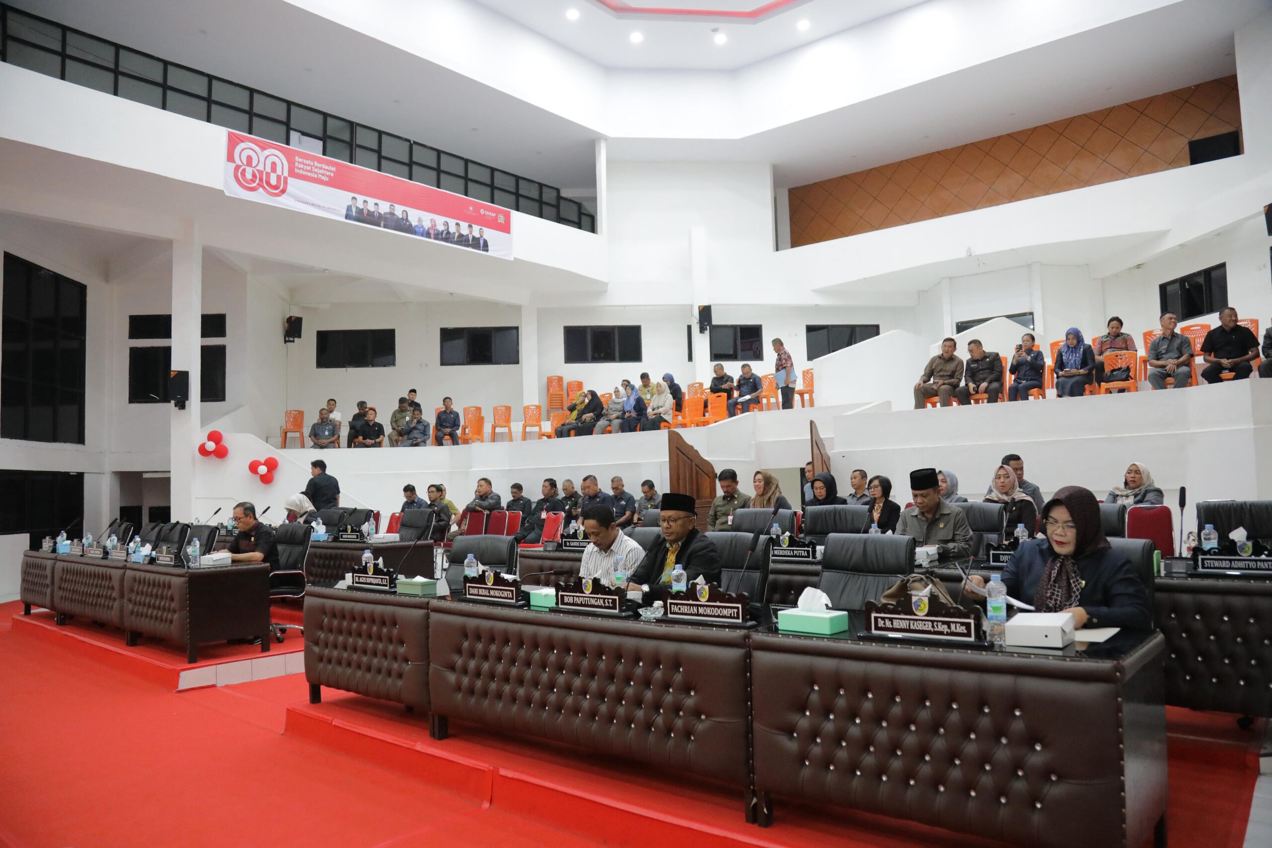 Rapat Paripurna yang dipimpin Ketua DPRD Kota Kotamobagu, Adrianus Mokoginta, S.E., tersebut juga dihadiri Wakil Ketua DPRD, Jusran Deby Mokolanot, S.Ag., M.Si., Ahmad Sabir, S.E., jajaran Forkopimda, Sekretaris Daerah Kota Kotamobagu Sofyan Mokoginta, S.H., M.E., para Asisten, pimpinan OPD, serta ASN di lingkungan Pemkot Kotamobagu.