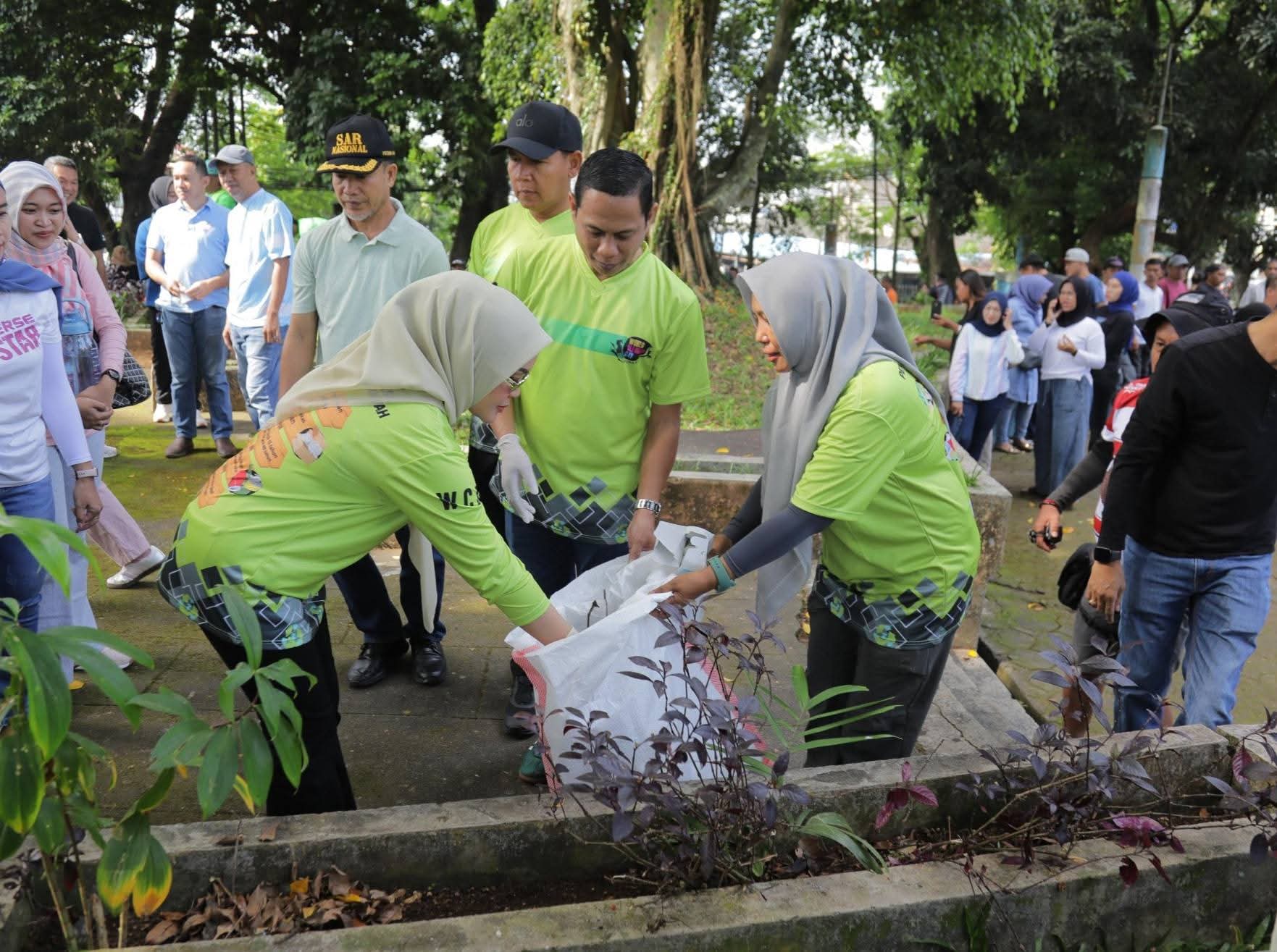 Dalam kegiatan tersebut, Wali Kota Weny Gaib bersama jajaran pemerintah, TP-PKK, dan aparat kepolisian, tampak berbaur dengan masyarakat dan relawan mengumpulkan sampah di area taman kota.