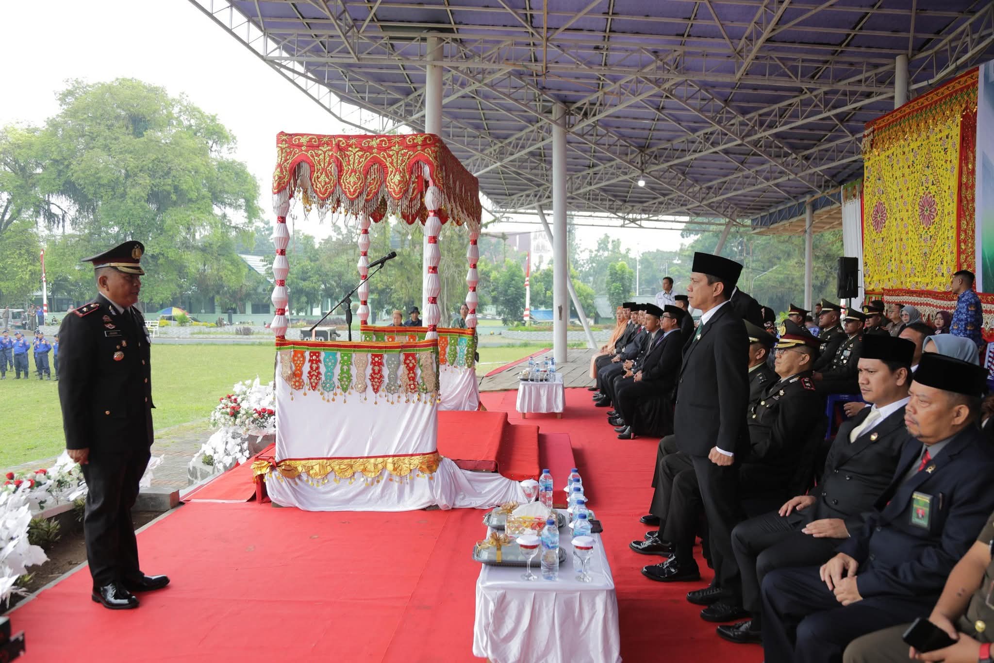Suasana upacara berlangsung tertib dan penuh penghormatan. Lagu-lagu perjuangan dikumandangkan, sementara seluruh peserta dengan khidmat mengikuti jalannya upacara hingga akhir.