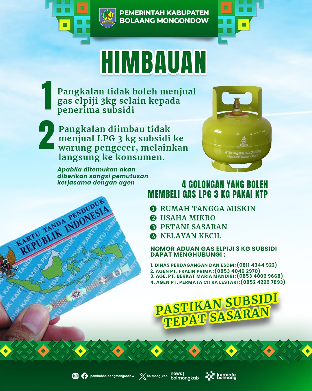“Kami tidak akan mentolerir pangkalan yang memanfaatkan situasi dengan menjual elpiji 3 kilogram di atas HET. Jika terbukti melanggar, izinnya akan kami cabut,” Tegas Bupati Yusra Alhabsyi.