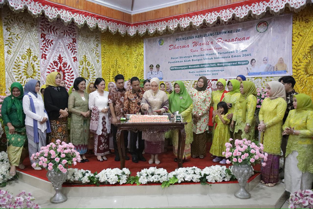KLIK24.NEWS Kotamobagu — Wali Kota Kotamobagu, dr. Weny Gaib, Sp.M., bersama Ketua TP PKK Kota Kotamobagu, Ny. Rindah Gaib Mokoginta, S.E., M.Ec.Dev., Wakil Wali Kota Kotamobagu, Rendy Virgiawan Mangkat, S.H., M.H., serta Wakil Ketua TP PKK Kota Kotamobagu, Ny. Resty A. Mangkat Somba, S.Sos., M.H., menghadiri Peringatan Hari Ibu ke-97 Tahun yang dirangkaikan dengan Hari Ulang Tahun ke-26 Dharma Wanita Persatuan (DWP), Jumat (19/12/2025), bertempat di Aula Rumah Dinas Wali Kota Kotamobagu.