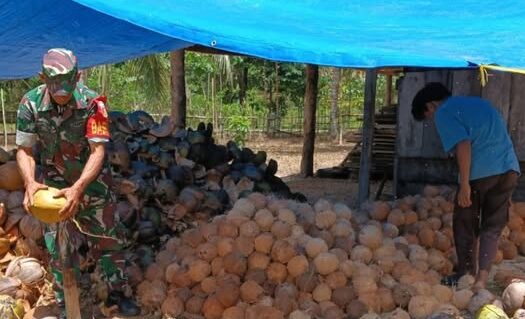Dengan penuh semangat, Sertu Muhlis turut membantu membelah kelapa serta menata hasil olahan untuk proses pengeringan. Kehadirannya tidak hanya meringankan pekerjaan secara fisik, tetapi juga memberi motivasi dan dorongan semangat kepada petani agar tetap optimis meningkatkan produksi serta kesejahteraan keluarga.