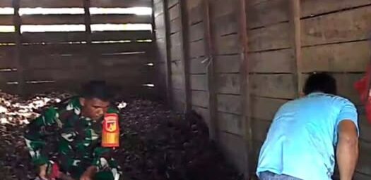 Di dalam gudang pengeringan kopra, Serda Salmun Amir tampak bahu-membahu bersama pemilik kopra. Ia membantu mengangkat kopra ke atas gerobak dorong untuk kemudian dijemur. Kehadiran Babinsa tersebut tidak hanya meringankan pekerjaan warga, tetapi juga memberikan semangat tersendiri bagi masyarakat yang menggantungkan penghidupan dari hasil pertanian kelapa.