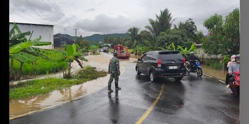 Menindaklanjuti kejadian itu, Babinsa Koramil 1303-12/Sangtombolang, Sertu Aris Manto, segera turun ke lokasi untuk melakukan pemantauan langsung. Selain memastikan kondisi warga dalam keadaan aman, ia juga membantu mengatur arus lalu lintas agar kendaraan roda dua maupun roda empat dapat melintas dengan tertib dan berhati-hati di titik genangan.