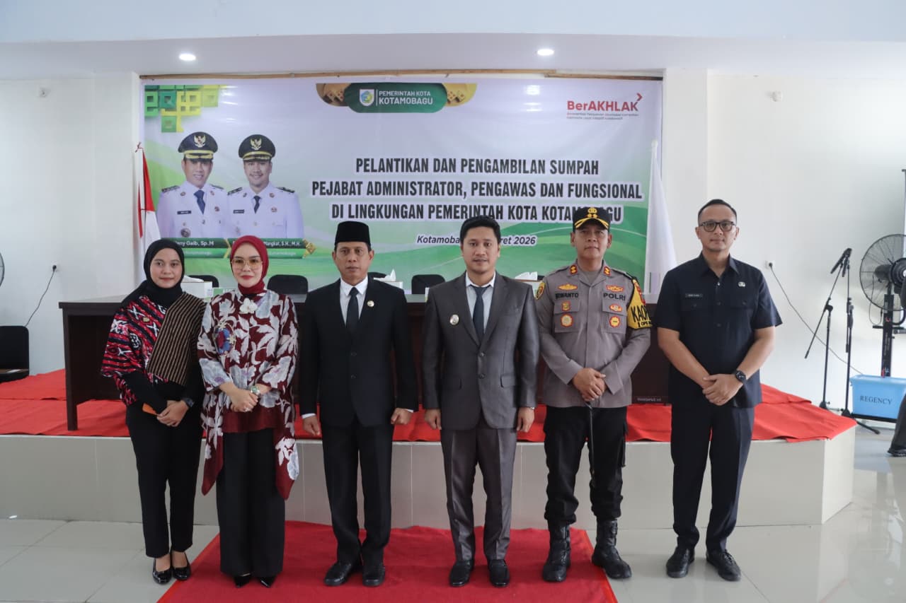 KLIK24.NEWS Kotamobagu – Kapolres Kotamobagu AKBP Irwanto, SIK, MH menghadiri upacara Pelantikan dan Pengambilan Sumpah Pejabat Administrator, Pengawas, dan Fungsional di lingkungan Pemerintah Kota Kotamobagu, yang dilaksanakan di Aula Dinas Perpustakaan dan Kearsipan, Kelurahan Kotobangon, Kamis (13/03/2026).
