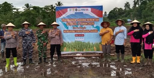 Momentum kebersamaan semakin terasa ketika seluruh unsur yang hadir turun langsung ke lahan untuk melakukan penanaman jagung secara simbolis, sebagai tanda dimulainya gerakan tanam jagung serentak di wilayah tersebut.
