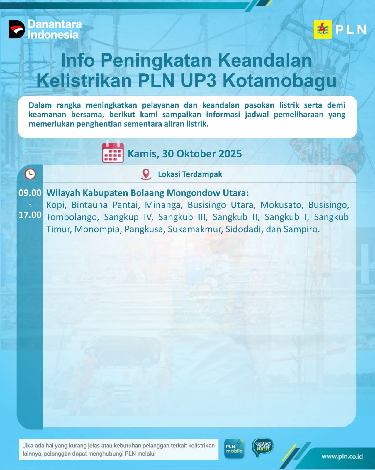• Lokasi terdampak: Wilayah ULP Bolmut, meliputi Kopi, Bintauna Pantai, Minanga, Busisingo Utara, Mokusato, Busisingo, Tombolango, Sangkup IV, Sangkup III, Sangkup II, Sangkup I, Sangkup Timur, Monompia, Pangkusa, Sukamakmur, Sidodadi, dan Sampiro.