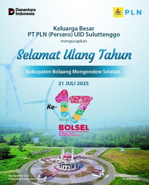 KLIK24.NEWS Manado — Keluarga Besar PT PLN (Persero) Unit Induk Distribusi Sulawesi Utara, Tengah, dan Gorontalo (UID Suluttenggo) menyampaikan ucapan Selamat Ulang Tahun ke-17 kepada Kabupaten Bolaang Mongondow Selatan (Bolsel) yang diperingati pada tahun 2025 ini.