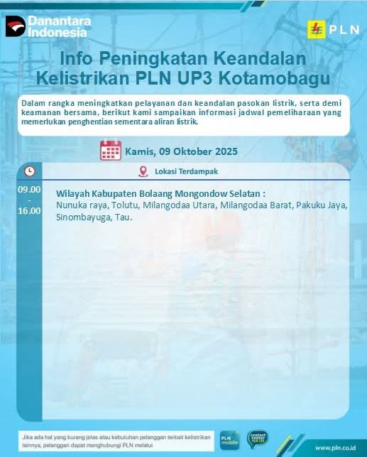 KLIK24.NEWS Bolsel – Dalam rangka meningkatkan pelayanan dan keandalan pasokan listrik serta demi menjaga keamanan bersama, PT PLN (Persero) akan melaksanakan pemeliharaan jaringan listrik di wilayah Kabupaten Bolaang Mongondow Selatan (Bolsel).