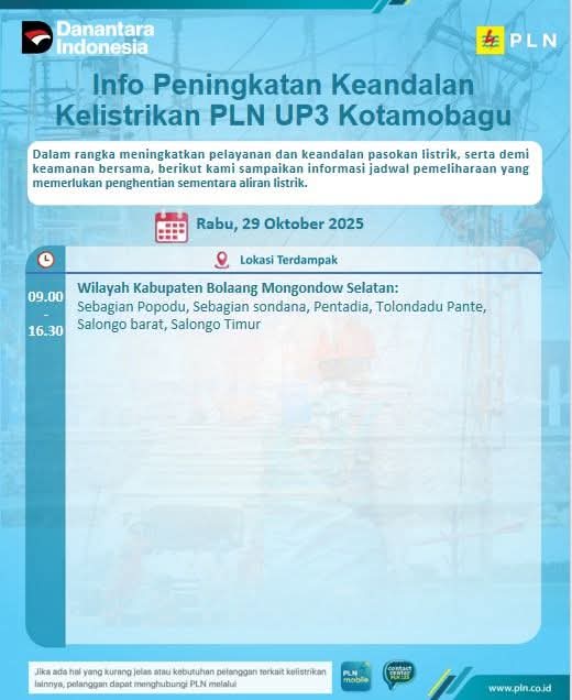 PLN Umumkan Jadwal Pemeliharaan Jaringan Listrik di Bolsel, Rabu 29 Oktober 2025