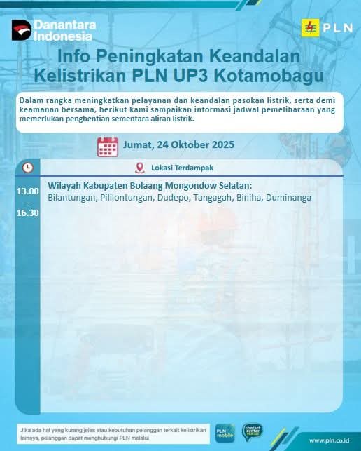 KLIK24.NEWS Kotamobagu — PLN UP3 Kotamobagu Dalam rangka meningkatkan pelayanan dan keandalan pasokan listrik serta demi menjaga keamanan bersama, PT PLN (Persero) UP3 Kotamobagu akan melaksanakan kegiatan pemeliharaan jaringan listrik pada Jumat, 24 Oktober 2025, pukul 13.00 hingga 16.30 WITA.