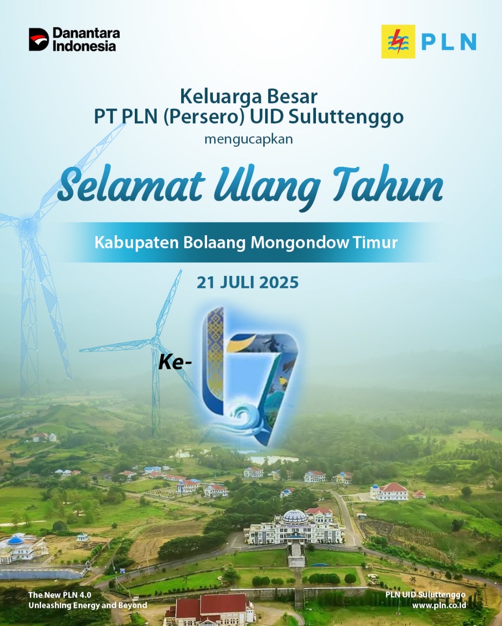 KLIK24.NEWS Manado — Keluarga Besar PT PLN (Persero) Unit Induk Distribusi Sulawesi Utara, Tengah, dan Gorontalo (UID Suluttenggo) mengucapkan Selamat Ulang Tahun ke-17 kepada Kabupaten Bolaang Mongondow Timur (Boltim) yang diperingati pada tahun 2025 ini.