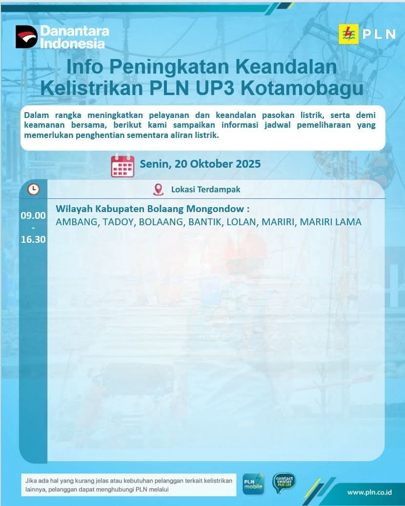 KLIK24.NEWS Kotamobagu — Info Peningkatan Keandalan Dalam rangka meningkatkan keandalan pasokan listrik dan kualitas pelayanan kepada pelanggan, PT PLN (Persero) UP3 Kotamobagu akan melaksanakan kegiatan pemeliharaan jaringan listrik yang memerlukan penghentian sementara aliran listrik di beberapa wilayah kerja.