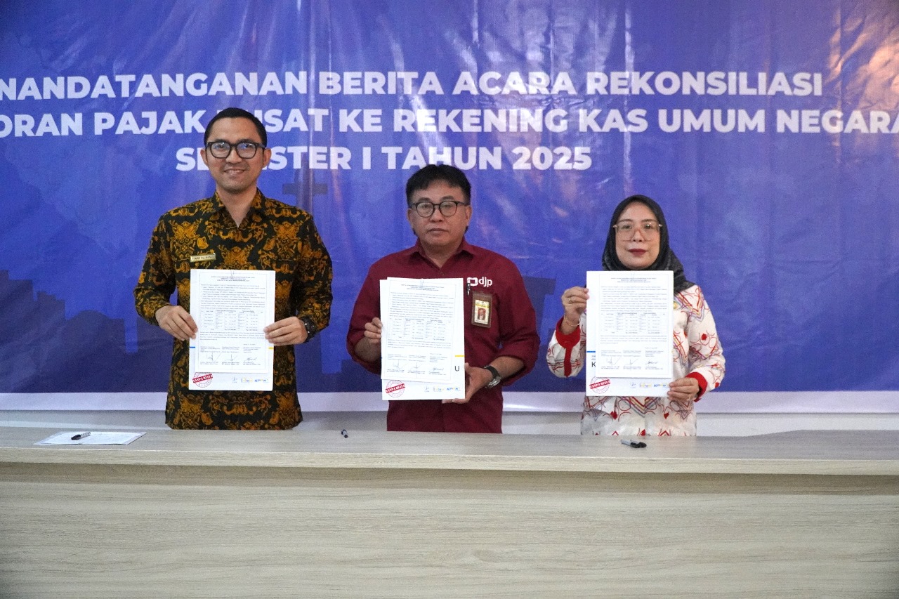 penandatanganan Berita Acara (BA) Rekonsiliasi atas Penyetoran Pajak Pusat Periode Semester I Tahun 2025 bertempat di Aula KPPN Kotamobagu (Kamis, 31/7).