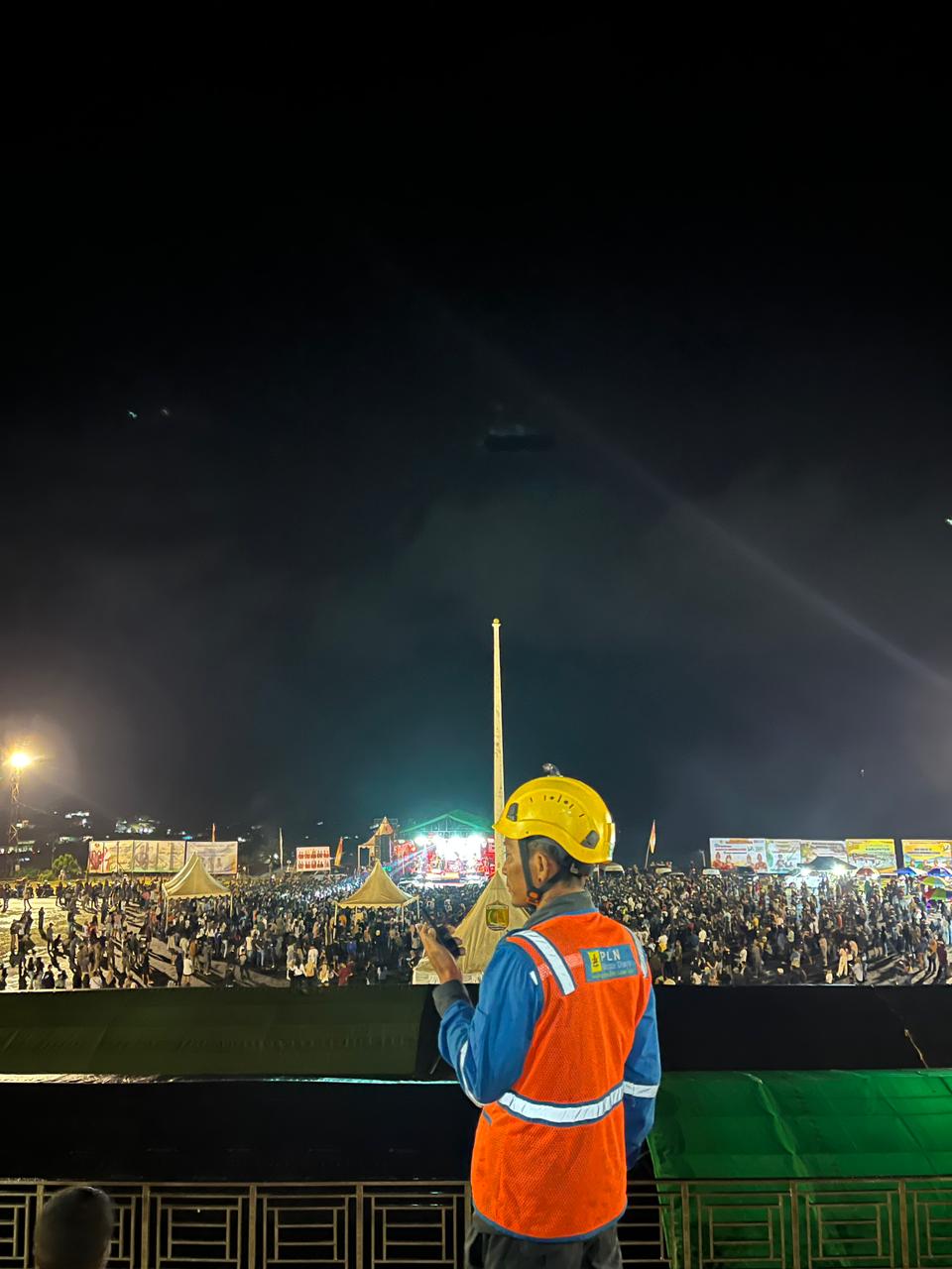 Petugas PLN sedang mengamankan listrik di acara puncak HUT Pemerintah Morowali Utara ke-12 yang bertempat di Lapangan Kantor Bupati, Kamis (23/10).