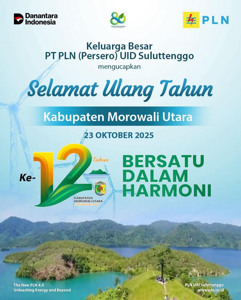 KLIK24.NEWS Morowali Utara — Keluarga besar PT PLN (Persero) Unit Induk Distribusi Sulawesi Utara, Tengah, dan Gorontalo (UID Suluttenggo) menyampaikan ucapan selamat ulang tahun ke-12 kepada Kabupaten Morowali Utara, yang diperingati pada 4 November 2025.
