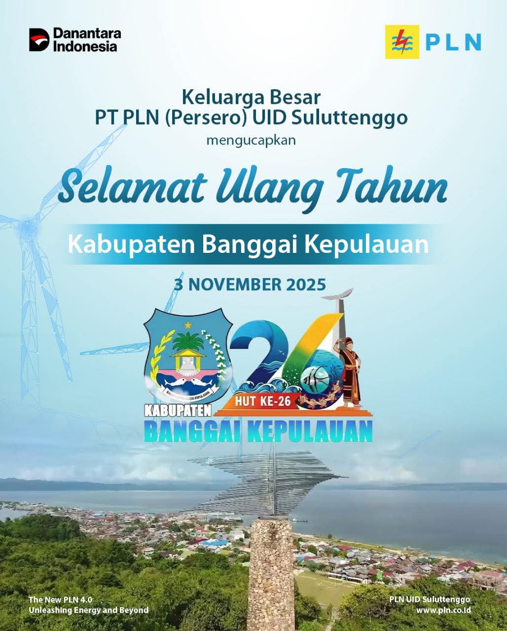 “Selamat Hari Ulang Tahun ke-25 Kabupaten Banggai Kepulauan. Semoga semangat pembangunan terus menyala untuk kemajuan daerah dan kesejahteraan masyarakat,” demikian pesan General Manager PLN UID Suluttenggo, yang mewakili seluruh insan PLN di wilayah Sulawesi Utara, Tengah, dan Gorontalo.