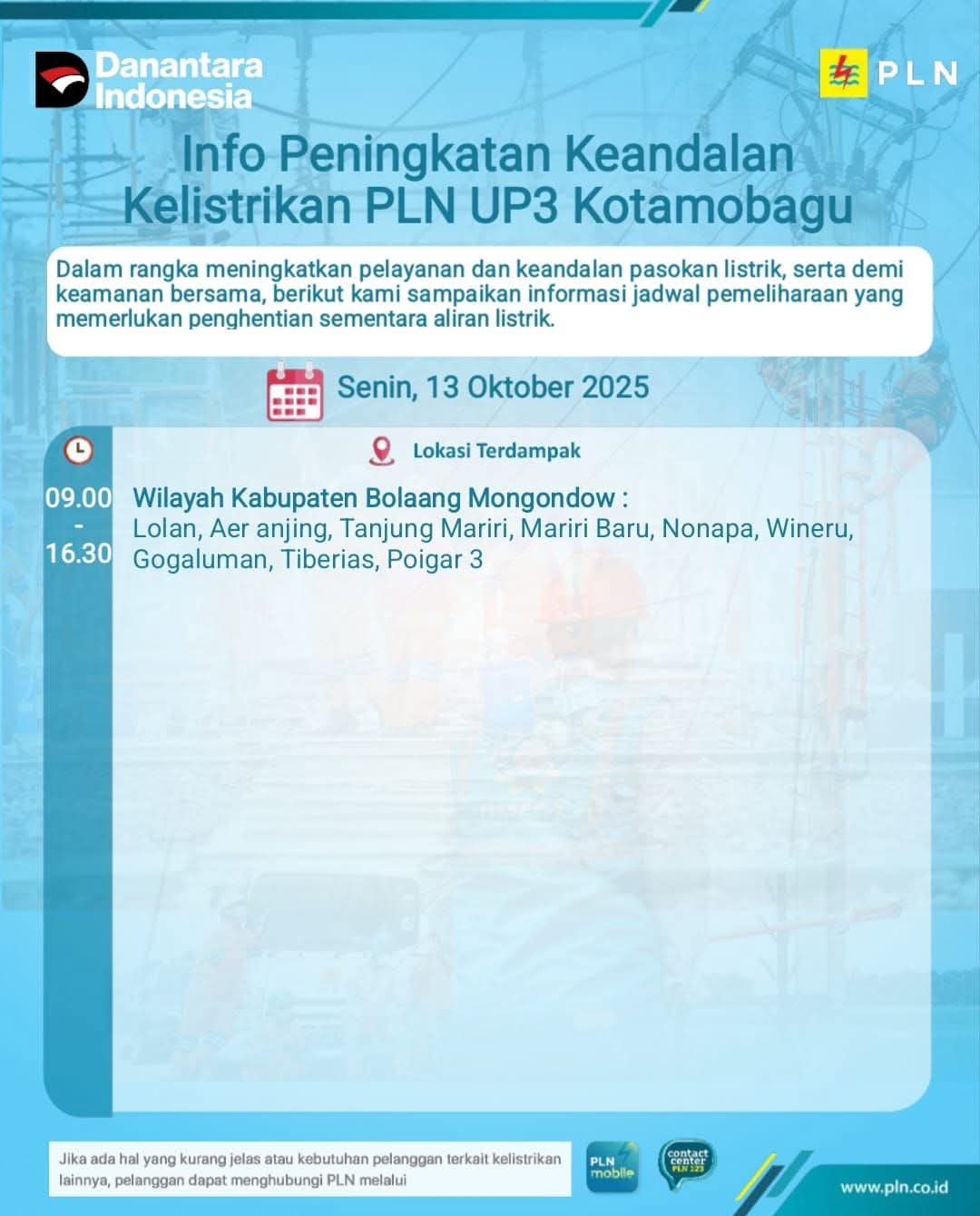 KLIK24.NEWS Kotamobagu – Dalam rangka meningkatkan pelayanan dan keandalan pasokan listrik serta demi menjaga keamanan bersama, PT PLN (Persero) Unit Pelaksana Pelayanan Pelanggan (UP3) Kotamobagu akan melaksanakan kegiatan pemeliharaan jaringan listrik yang berdampak pada penghentian sementara aliran listrik di beberapa wilayah Kabupaten Bolaang Mongondow.