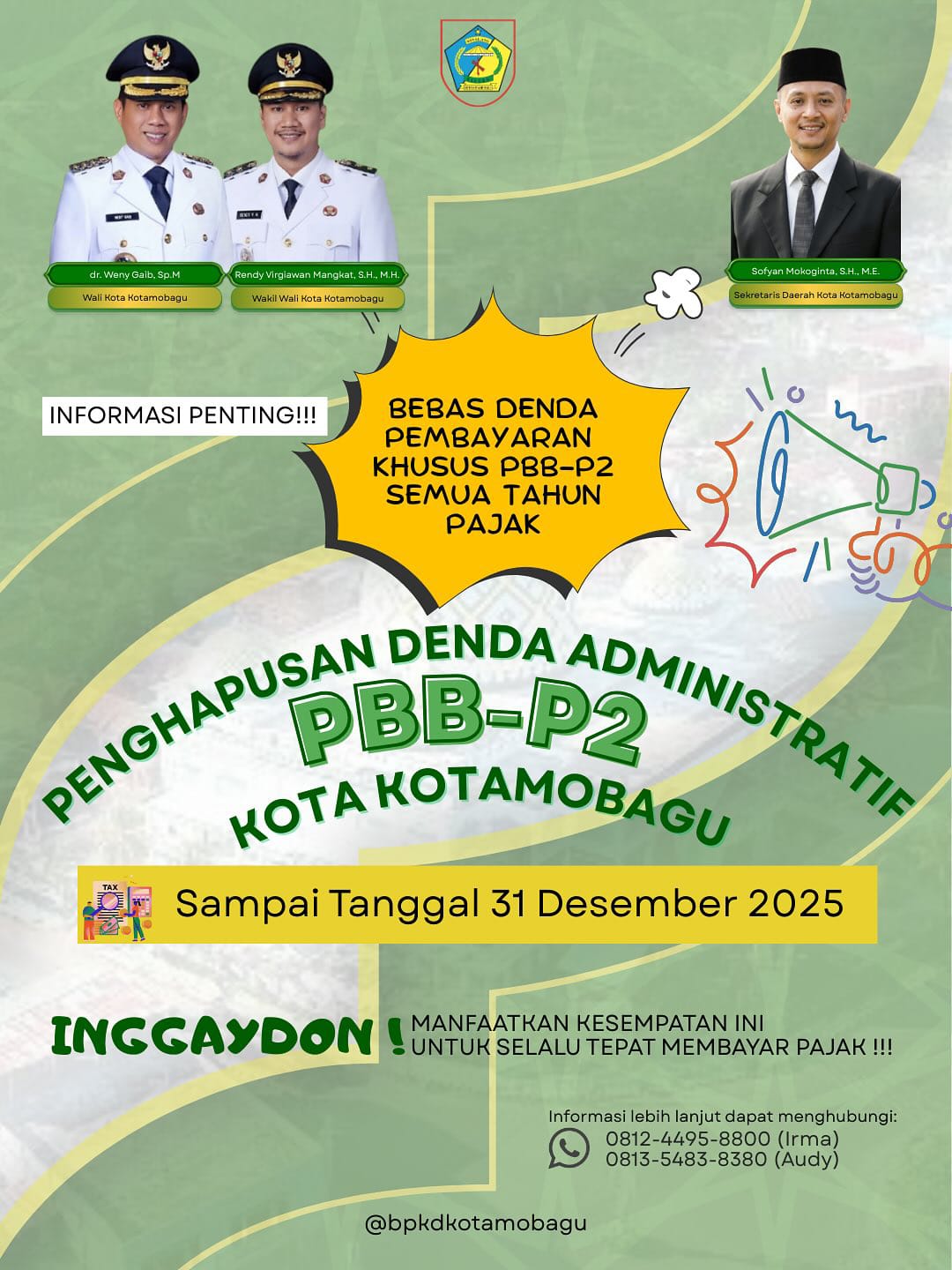 “Pemerintah Daerah Kota Kotamobagu memberikan kesempatan kepada seluruh wajib pajak untuk melakukan pembayaran Pajak Bumi dan Bangunan tanpa dikenakan denda administrasi. Kebijakan ini berlaku hingga 31 Desember 2025,” ungkapnya.