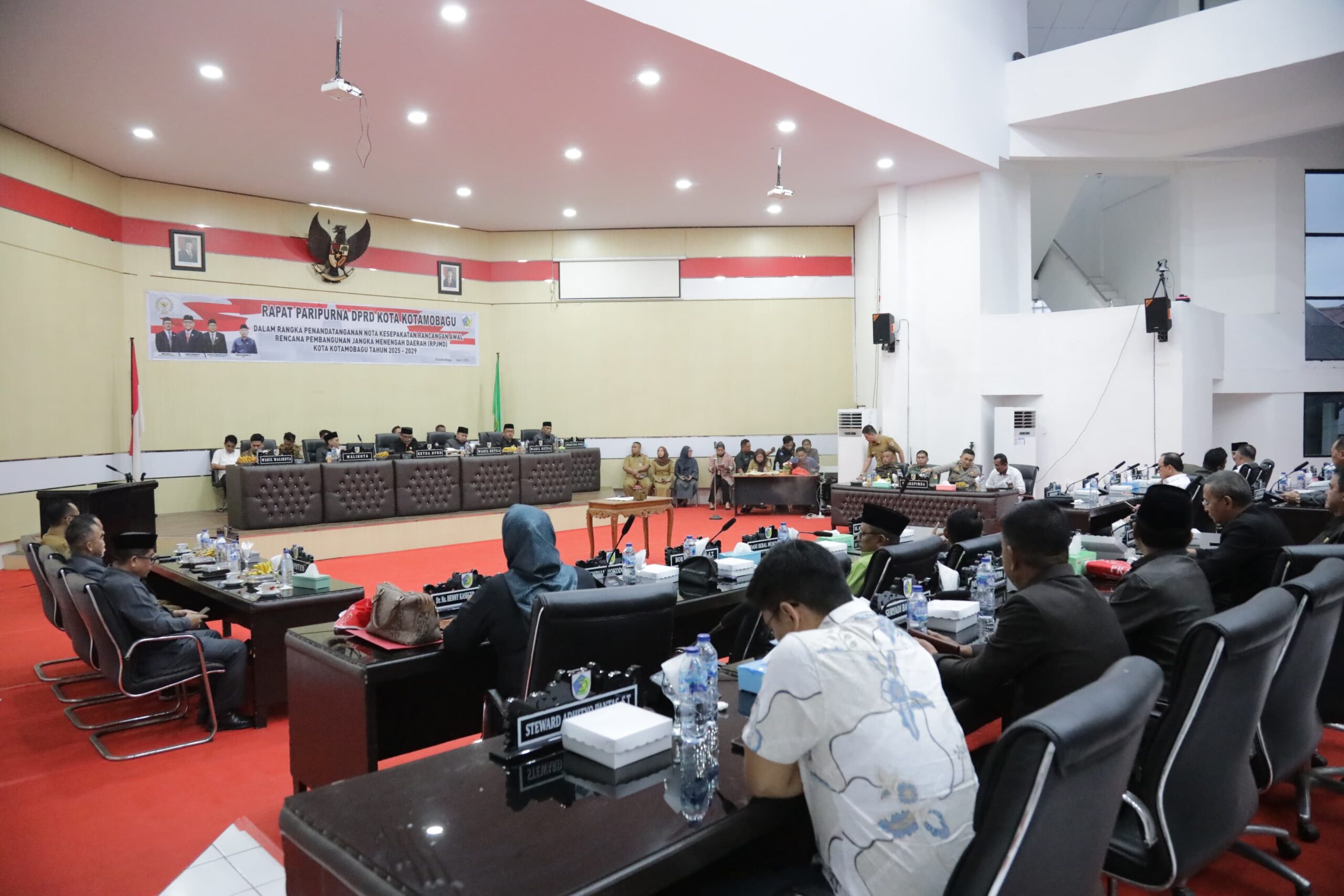 Rapat Paripurna dipimpin langsung oleh Ketua DPRD Kota Kotamobagu, Adrianus Mokoginta., S.E., dan turut dihadiri Wakil Ketua DPRD Jusran Deby Mokolanot., S.Ag., M.Si., serta Ahmad Sabir., S.E.