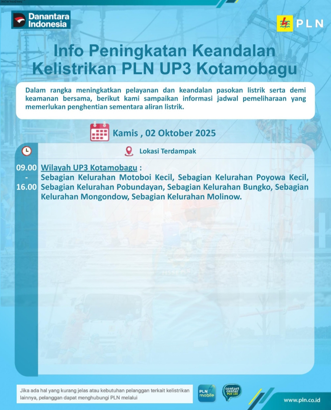 PLN UP3 Kotamobagu Umumkan Jadwal Pemeliharaan Listrik 2 Oktober 2025, Sejumlah Kelurahan Terdampak