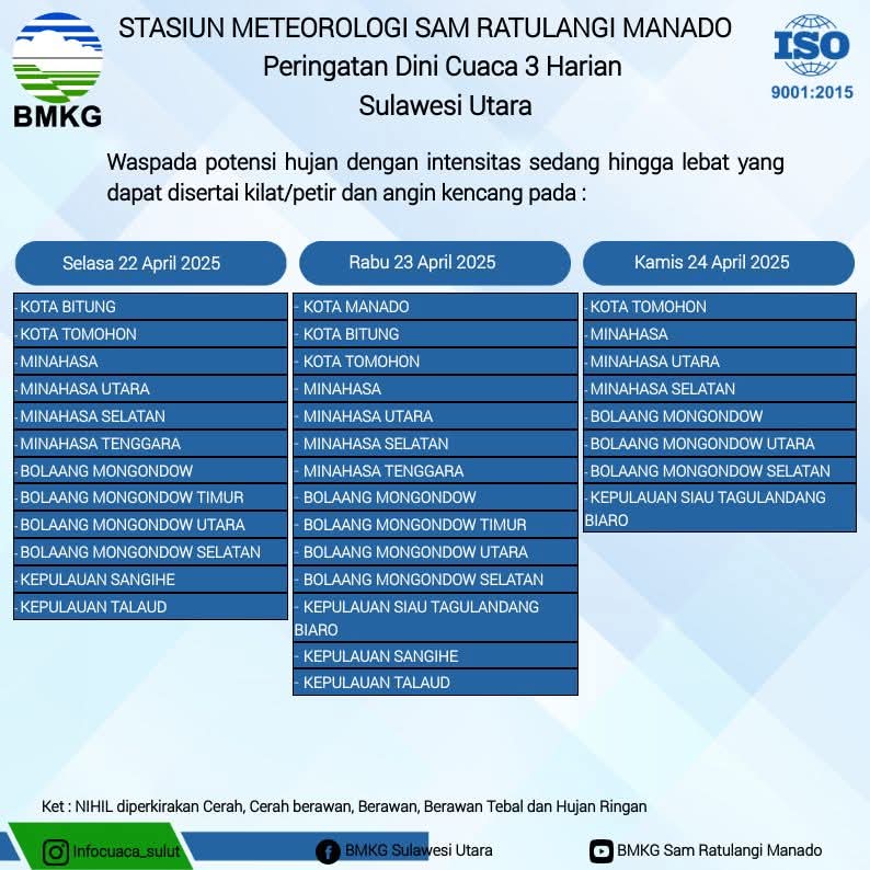 KLIK24.NEWS Manado — Badan Meteorologi, Klimatologi, dan Geofisika (BMKG) Provinsi Sulawesi Utara mengeluarkan Peringatan Dini Cuaca Ekstrem yang berlaku selama tiga hari, mulai Selasa, 22 April 2025 hingga Kamis, 24 April 2025.