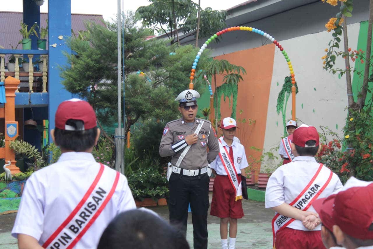 Suasana upacara berlangsung khidmat namun penuh semangat. Usai kegiatan formal, anak-anak diajak berinteraksi langsung dengan personel Polri melalui sesi edukatif yang menyenangkan. Mereka dikenalkan pada profesi polisi, aturan lalu lintas, hingga tanya jawab ringan yang membangun kedekatan emosional antara polisi dan siswa.