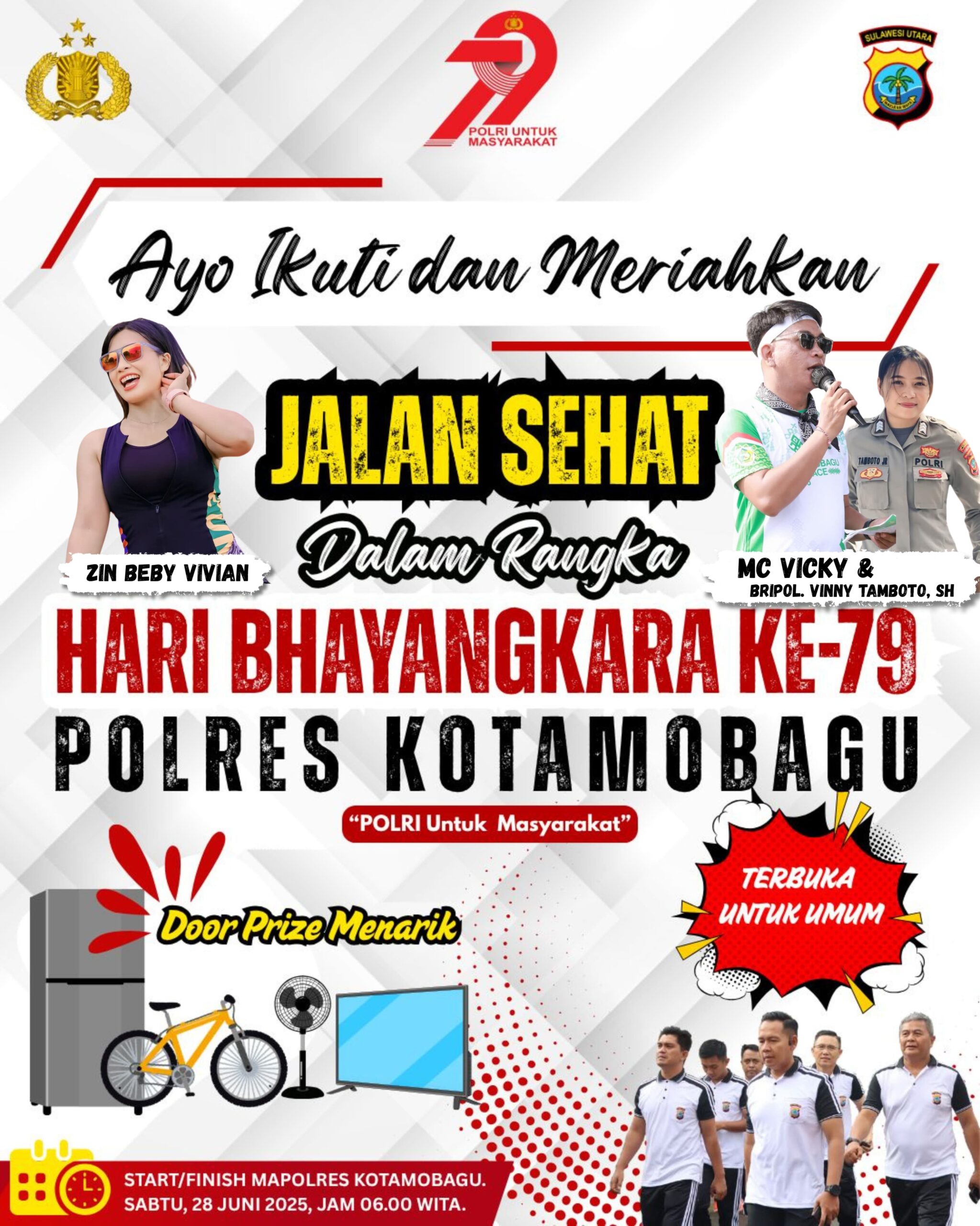 KLIK24.NEWS Kotamobagu — Dalam rangka memperingati Hari Bhayangkara ke-79, Polres Kotamobagu mengundang seluruh lapisan masyarakat untuk ikut ambil bagian dalam kegiatan Jalan Sehat Bersama, yang akan digelar pada Sabtu, 28 Juni 2025, mulai pukul 06.00 WITA, dengan lokasi start dan finish di Mapolres Kotamobagu.