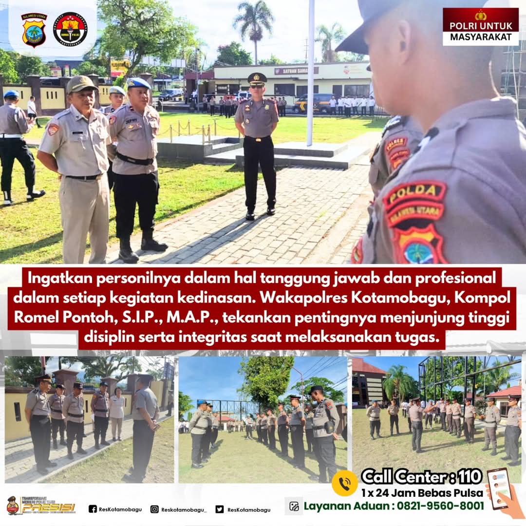 KLIK24.NEWS Kotamobagu — Wakil Kepala Kepolisian Resor Kotamobagu, Kompol Romel Pontoh, S.I.P., M.A.P., kembali mengingatkan seluruh personel untuk selalu mengedepankan tanggung jawab, profesionalisme, disiplin, dan integritas dalam setiap pelaksanaan tugas kedinasan.