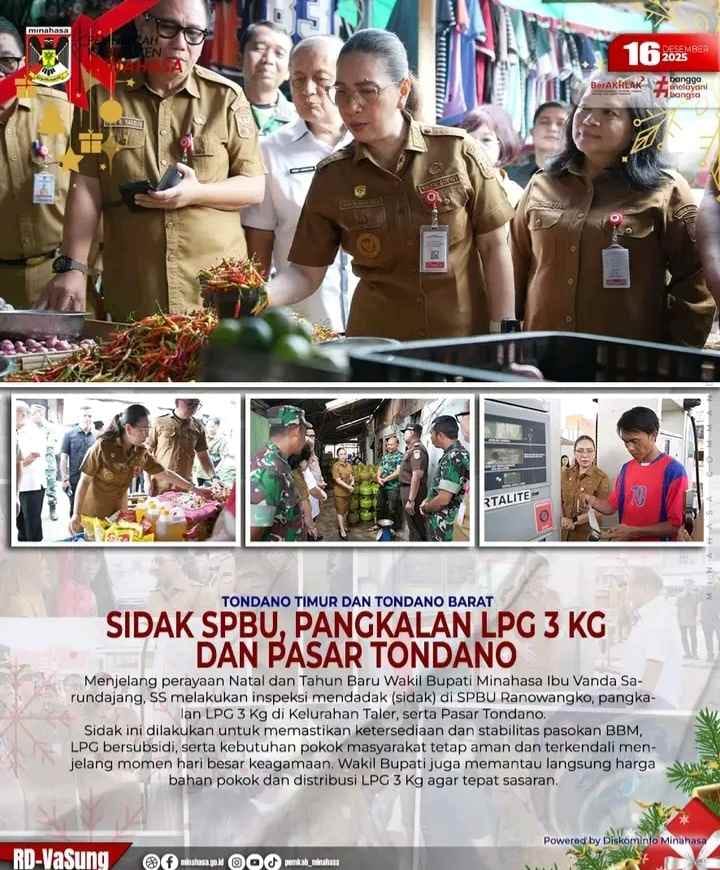 Minahasa,Klik24.News- Menjelang Perayaan Natal dan Tahun Baru Wakil Bupati Minahasa Vanda Sarundajang SS, melakukan Sidang dadakan (Sidak) terkait SPBU Serta Pangkalan LPG 3 Kg. Bertempat Kelurahan Taler, serta Pasar Tondano. 18/12/2025.